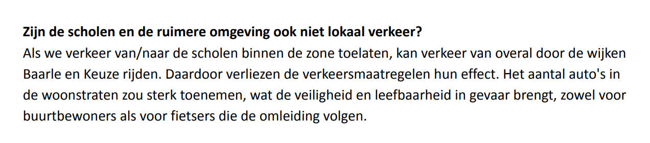 Om sluipverkeer te voorkomen tijdens de werkzaamheden, wordt in de AWV brief van 24 maart 2025 meegedeeld dat de toegang beperkt is voor de wijken Baarle en Keuze. Alleen plaatselijk verkeer is toegestaan. Maar wat wordt precies bedoeld met de "Wijk Baarle"?Het handhaven van lokaal verkeer is bijzonder uitdagend, zeker wanneer Wegen en Verkeer zelf niet duidelijk definieert wie of wat de Wijk Baarle precies inhoudt. Dit zorgt voor juridische onduidelijkheid over wie er nog mag rijden.De scholen, jeugdbeweging, het rusthuis, de bakker en de slagers zijn niet de Wijk Baarle?